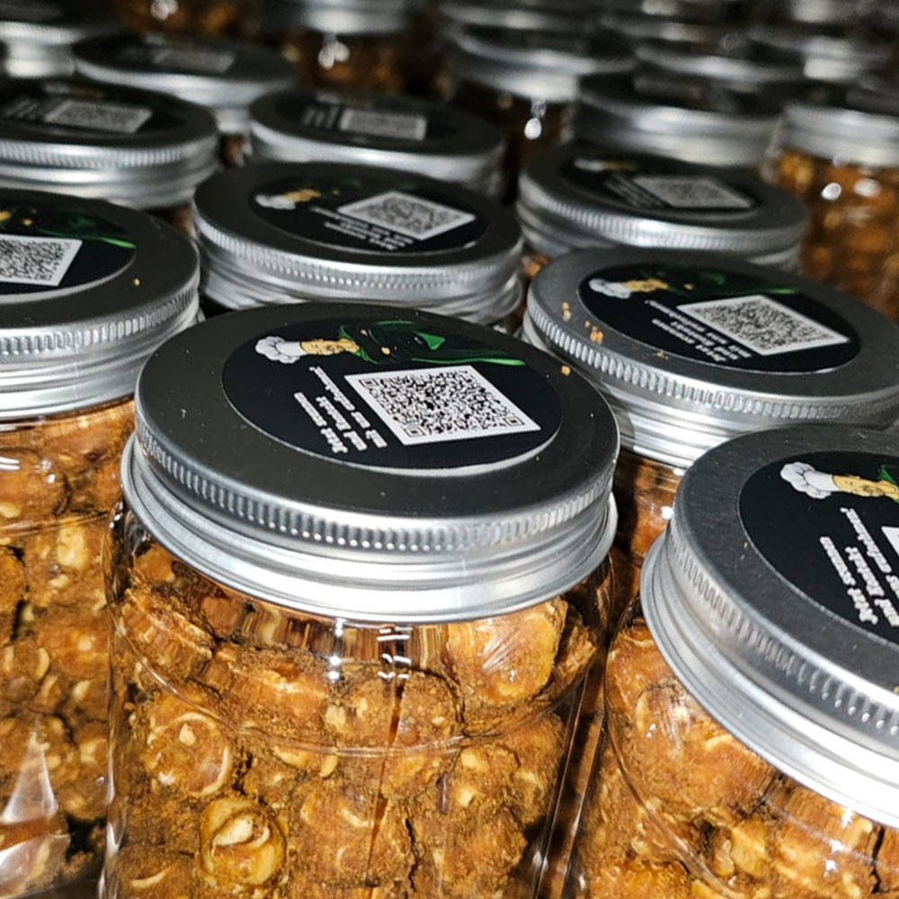 Ihre Verpackung – perfekt abgestimmt auf Ihr Branding: mit Ihrem Logo, Ihrem Eventdesign oder in Ihren Firmenfarben. Wählen Sie zwischen praktischen Beuteln (80 g) oder eleganten Boxen, und mischen Sie nach Wunsch die Sorten. Ideal als Werbegeschenk, Messe-Snack oder Mitarbeiter-Leckerei – nachhaltig verpackt, köstlich, und immer ein Hingucker.