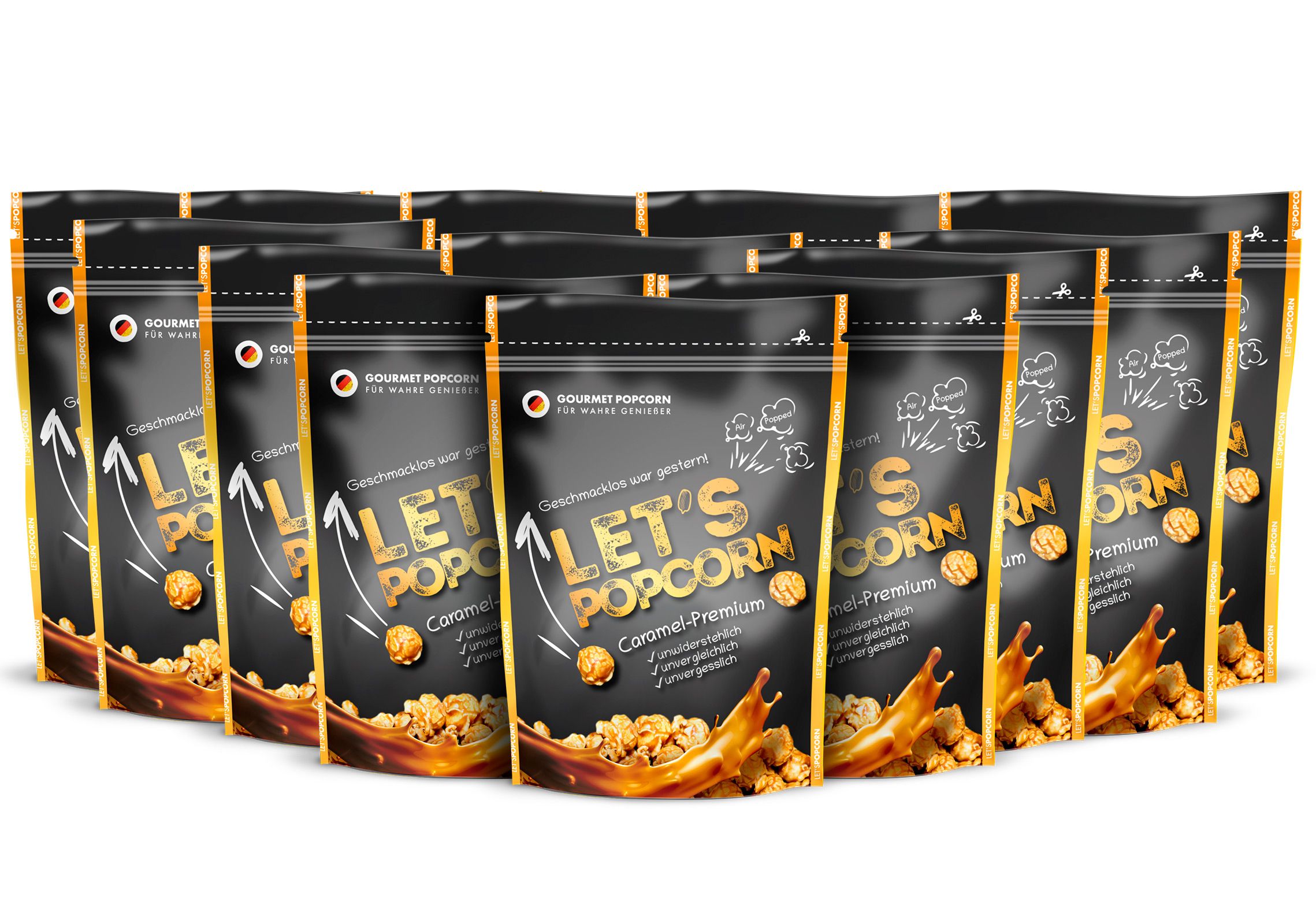 13x 100 g/Packung Air-Popped Karamell Popcorn mit Karamellgebäck – Creme und Milchschokostreusel (53%).